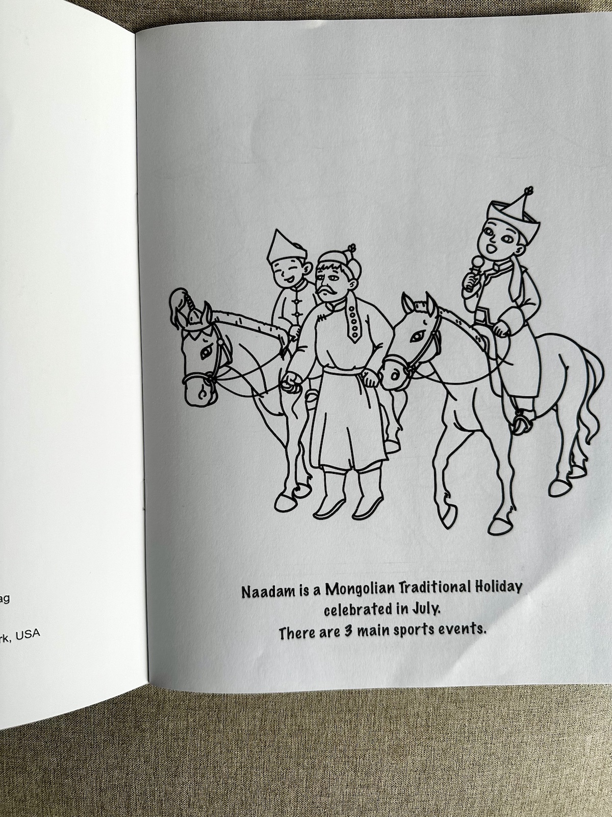 “My Naadam” is a children’s coloring book made by Mongolian Cultural Council. Writer: Sidd Goldstein and Illustrator: Dalaijargal Battumur.
