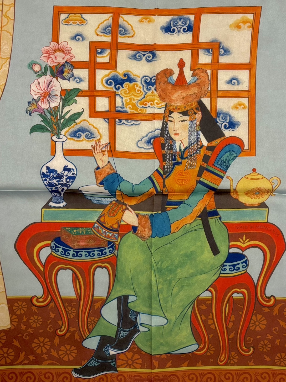 The print is a scene of a sitting Mongolian lady in traditional costume. The vibrant colors are blue, orange, green, and cream.